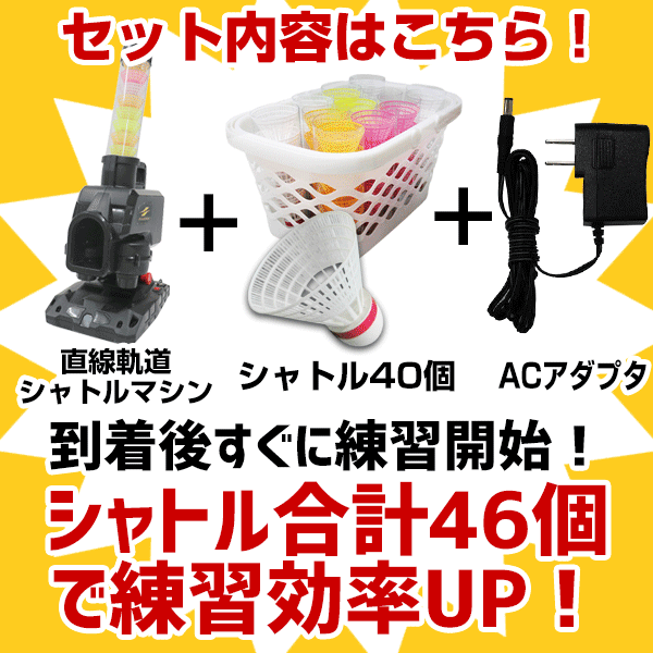 ↓ラッピング(290円/税込)のご注文はコチラ↓ 【検索ワード:ラッピング 贈りもの 贈り物 贈物 贈答品 プレゼント ギフト お祝い 記念品 卒業 卒団】プレゼント交換 ギフトボックス】 商品説明 大人気のシャトルバッティング(直線軌道)マシンがアダプター+シャトル40個の豪華3点セットで新登場! シャトル合計46個で練習効率UP間違いなし!! パートナー不要でシャトル打ちが実現! 段階別で角度・高さが調整できるので、幅広い年代のプレーヤーがお使いいただけます。